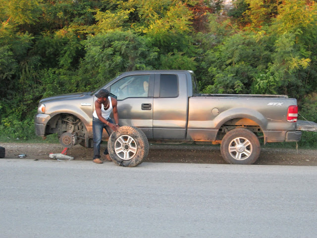No more than 30 minutes into our drive, as I was nodding off to sleep sitting in the front seat of the F150 pickup, a loud bang and violent sway of the vehicle shook me and caught my undivided attention.  As the truck bounced along the smooth stretch of Route 2, I realized we had lost a tire - likely at around 50mph.  Keeping in mind that Route 2 is about as wide as any 2-way city street in the States, littered with livestock, motorcycles, buses, tap taps, people walking, people on bicycles, losing control of a vehicle can be, and often is, a deadly incident.  Thanks to the skills of my driver and friend Francky, I breathed a sigh of relief as the truck came to a wobbly stop on the muddy shoulders of Route 2.